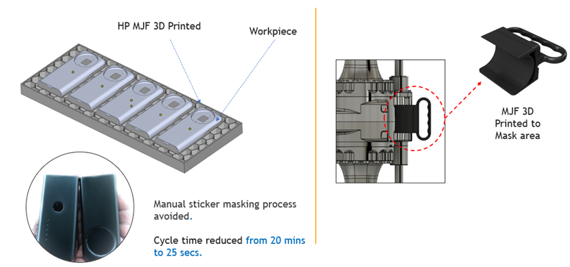 Manual masking using tapes and stickers consumed nearly 20 minutes per part. An HP MJF-printed masking jig reduced cycle time dramatically.